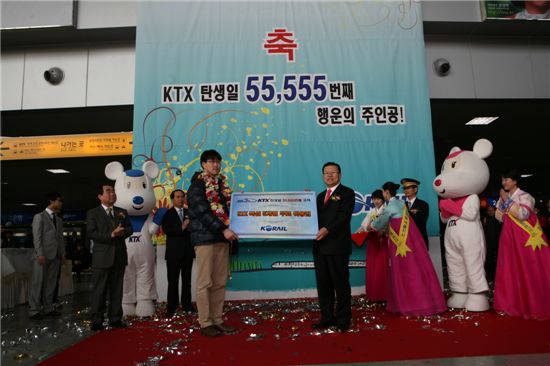 코레일(사장 허준영)은 1일 KTX 개통 5주년을 맞아 5만5555번째 이용객인 심 씨에게 KTX고객을 대표로 감사의 마음을 전했다.