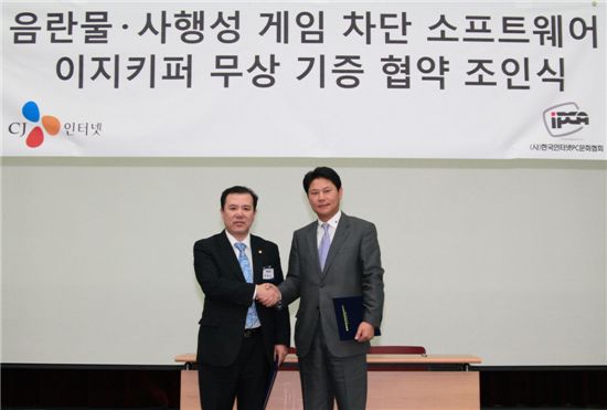 CJ인터넷(대표 정영종)은 음란물·사행성 사이트 차단 프로그램 '이지키퍼'를 한국인터넷PC문화협회(IPCA, 회장 김찬근)에 무상 기증했다고 2일 밝혔다. IPCA는 이 프로그램을 PC방 등에 무상 공급한다. CJ인터넷과 IPCA는 이같은 내용의 조인식을 지난 3월 30일 서울 무역 전시컨벤션 센터에서 열린 IPCA 정기총회를 통해 가졌다.