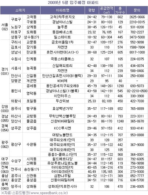 2일 스피드뱅크에 따르면 시도별로 서울 1448가구, 경기 5319가구가 새 주인을 맞게 된다. 경기지역과 서울지역은 4월에 비해 각각 17배 이상, 20% 가량의 물량 증가를 나타냈다.