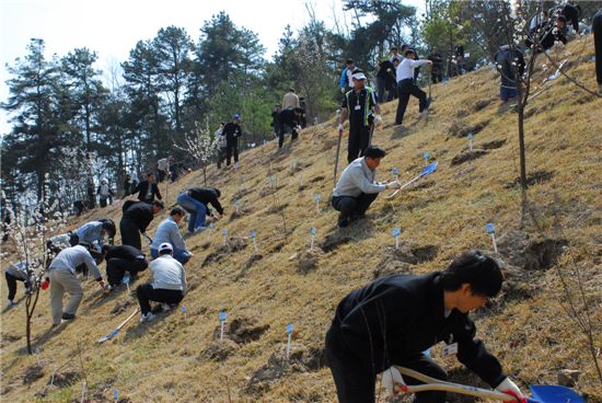 한전원자력연료(주)는 식목일을 앞두고 2일 회사 내의 야트막한 동산에서 직원들이 각자 자비로 산 370여 그루의 묘목을 심었다. 이 회사 관계자는 “언제부턴가 몇몇 직원들이 자녀들의 출생, 입학, 졸업, 성년 등 특별한 날을 기념하기 위해 스스로 나무를 사 심기 시작한 것이 계기가 돼 이런 행사가 마련됐다”고 말했다.