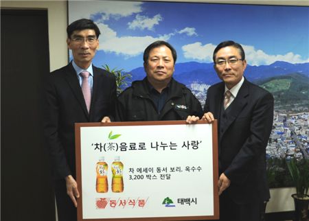 이날 전달된 음료는 5000만원 상당의 동서 차에세이 보리ㆍ옥수수 등 3200박스였다. 최근 유례 없는 가뭄으로 인해 정부 차원에서 비상 대책을 마련해 식수를 지원받고 있는 태백 시민들을 위한 것이라고 회사 측은 밝혔다.