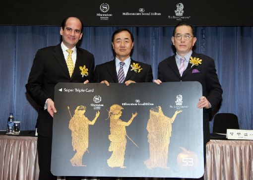 스완슨 총지배인과 유용중 쉐라톤 그랜드 워커힐 호텔 사장, 맹무섭 리츠칼튼 호텔 사장은 이날 3개 특 1급 호텔이 참여하는 통합 멤버십 서비스 카드 '슈퍼 트리플(SUPER TRIPLE)' 출시 기념식을 가졌다.