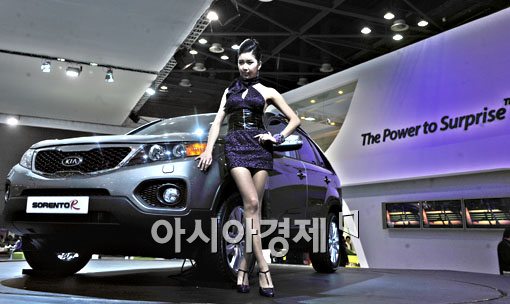 6일 일산 킨텍스에서 열리고 있는 '2009 서울모터쇼'에서 한 레이싱 모델이 기아자동차의 '쏘렌토R'앞에서 포즈를 취하고 있다.