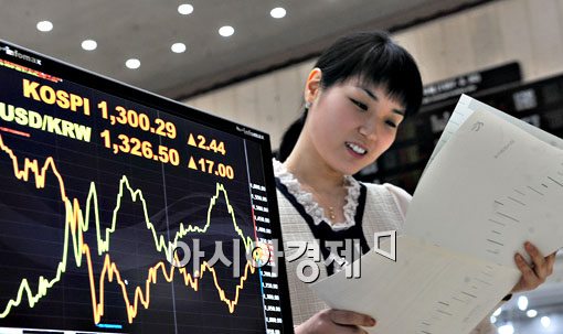 7일 코스피지수가 장 초반 1300대를 돌파하자 서울 여의도 한국거래소의 한 직원이 현황 모니터앞에서 밝은 모습으로 서류를 살펴보고 있다.