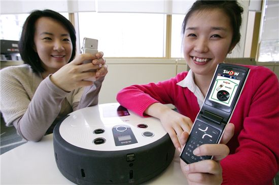 '영상통화 로봇청소기'는 로봇청소기에 영상통화 기능을 갖춘 것으로 SHOW휴대폰만 있으면 언제 어디서든지 원격으로 로봇청소기를 조정할 수 있다.