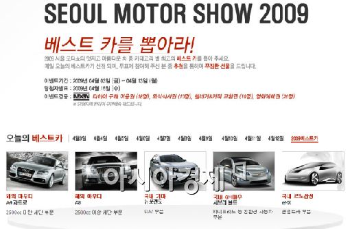 본지가 2009 서울모터쇼 개막과 함께 진행 중인 '서울 모터쇼 베스트카를 뽑아라' 인터넷 투표에 네티즌들의 관심이 뜨겁게 달아오르고 있다.