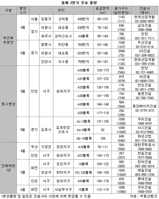 2분기 분양물량 중 대부분 인구유입이 많은 지역에 위치한 재건축 후분양 아파트와 인천 청라지구, 김포 한강신도시 등에서 이뤄지는 동시분양, 전매제한 기간이 1년인 공공택지분양 물량을 살펴보자.