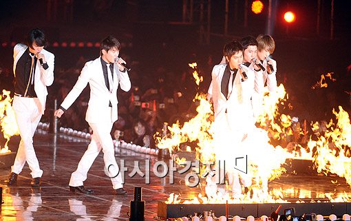 [아시아경제신문 윤태희 기자]동방신기가 12일 오후 서울 방이동 올림픽공원 내 체조경기장에서 열린 '2009 스파클링 콘서트'에서 '주문(MIROTIC)'을 열창했다.