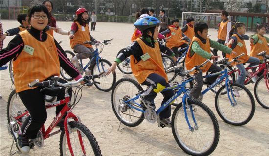 지난 11일 오후. 마포구 성원초등학교 운동장에 주황색 조끼를 맞춰 입은 20명의 어린이들이 자전거 타기에 한창이다. 이제 막 자전거를 배우기 시작했는지 균형 잡기에 열심인 이들은 바로 마포구에서 운영하는 자전거 교실에 참가 중이다.