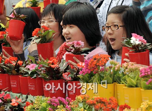 도시지역 어린이들이 꽃을 키우면서 농업의 가치를 알게 해주기 위해 농협과 농림식품수산부가 개최하는 '꽃 사랑 농업사랑 체험교실'이 13일 서울 미동초등학교에서 열렸다. 이날 꽃을 받아든 학생들이 꽃 사랑을 다짐하고 있다.