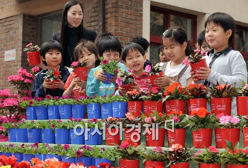 도시지역 어린이들이 꽃을 키우면서 농업의 가치를 알게 해주기 위해 농협과 농림식품수산부가 개최하는 '꽃 사랑 농업사랑 체험교실'이 13일 서울 미동초등학교에서 열렸다. 이날 꽃을 받아든 학생들이 꽃 사랑을 다짐하고 있다.