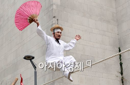 13일 세종문화회관 예술의 정원에서 열린 '2009 봄 세종뜨락축제'에서 김대균 선생이 줄타기 공연을 선보이고 있다. 이날 공연을 시작으로 5월 15일까지 열리는 '뜨락 축제'는 발레와 뮤지컬, 대중음악, 합창, 탭댄스, 클래식 등 다양한 장르의 문화 공연이 24회에 걸쳐 무대에 오른다.