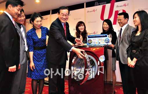 대우일렉은 15일 서울 중구 명동 세종호텔에서 세계 최초 자동 세제 투입 시스템이 적용된 '드럼업(Drum_Up) II' 신제품 출시 발표회를 가졌다.