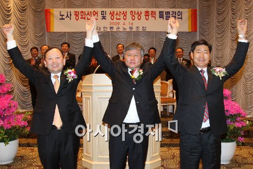 16일 광양 필레모 호텔에서 열린 ‘2009년 대한통운노동조합 정기 전국대의원대회’에서 대한통운노동조합은 ‘노사평화 선언 및 생산성 향상 총력 결의 특별결의문’을 발표했다.