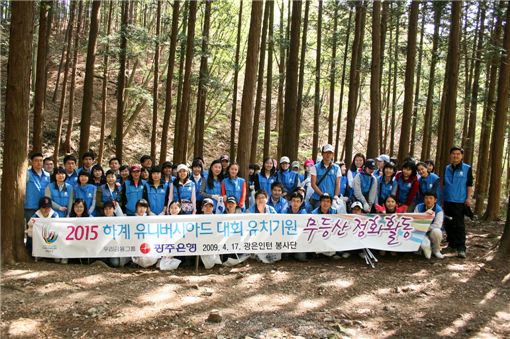 지난 17일에는 광주은행인턴 70여명이 무등산 근처의 쓰레기를 수거하며 자연보호에 나섰다. 이와 함께 산불예방과 유니버시아드 유치 기원 캠페인도 펼쳤다.