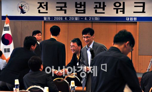 신영철 대법관의 거취와 사법행정 개선방안을 논의하기 위한 전국법관회의가 20일 천안 상록리조트에서 열린 가운데 회의에 참석한 판사들이 회의 시작전 삼삼오오 모여 의견을 나누고 있다.