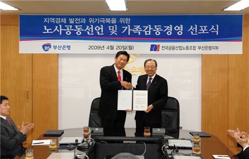 부산은행은 20일 본점에서 이장호 부산은행장과 정석민 노조위원장이 참석해 '노사공동선언'과 '가족감동경영' 선포식을 개최했다고 밝혔다. 부산은행 노사는 이날 일자리 창출을 위해 임원은 연봉의 15%, 지역본부장 10%. 부실점장은 5%를 반납하고 일반직원은 연차휴가를 의무적으로 사용하기로 했다.
