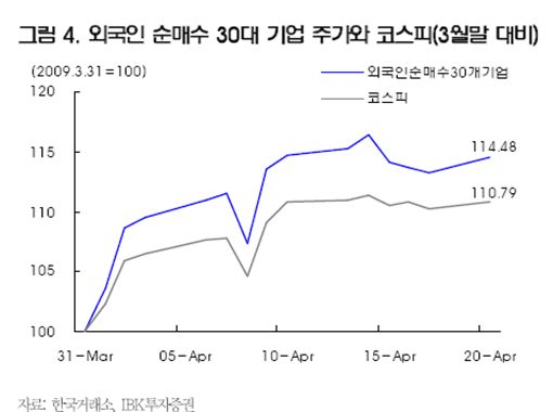 박옥희 IBK증권 애널리스트는 21일 "외국인들이 4월 들어 순매수한 종목 상위 30개를 뽑아 이들의 주가 추이를 지수화해 본 결과 코스피 대비 아웃퍼폼한 것으로 나타났다"며 "이들 종목 중 유동성 장세에서 뿐만 아니라 실적으로도 계속 지지 받을 종목을 찾는 것이 중요하다"고 밝혔다.