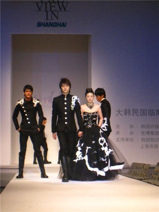 앙드레 김은 22일 상하이 상하이마트에서 열린 대한민국 섬유패션대전 프리뷰 인 상하이 2009에서 중국의 웅장하고 화려한 전통미와 한국의 동양적인 아름다움을 재해석한 146개 작품을 선보였다. 사진은 리허설하고 있는 김준과 장나라의 모습.
