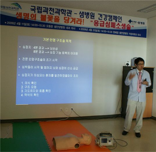 국립과천과학관(관장 장기열)은 오는 25일 관람객과 직원을 대상으로 생활 속에서 일어날지도 모르는 만일의 사고에 대비해 응급처치와 심폐소생술에 관한 강연회를 실시한다고 22일 밝혔다.