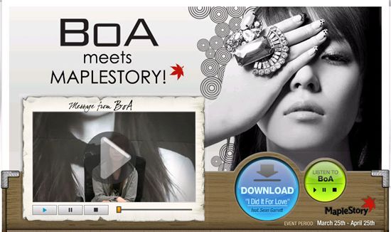 이번 프로모션이 진행되는 사이트(maplestory.nexon.net/Promo/boa.aspx)에서는 메이플스토리 사용자들을 위한 보아의 인사말 동영상을 볼 수 있고, 보아의 미국 1집 타이틀곡 'I Did It For Love'도 내려 받을 수 있다. 또 보아의 신곡과 메이플스토리 게임 영상을 이용해 사용자들이 직접 UCC(User Created Contents) 뮤직비디오를 제작하는 이벤트도 진행된다. 이번 프로모션은 오는 25일까지 계속될 예정이다.