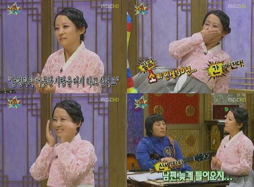 ‘남편과 애틋한 사랑을 다시 해 보고 싶다’는 고민을 털어놓은 김영임은 22일 방송에서 남편 이상해와의 첫 만남부터 결혼에 이르기까지 설명하며 MC인 강호동과 유세윤, 우승민의 웃음보를 터뜨렸다.