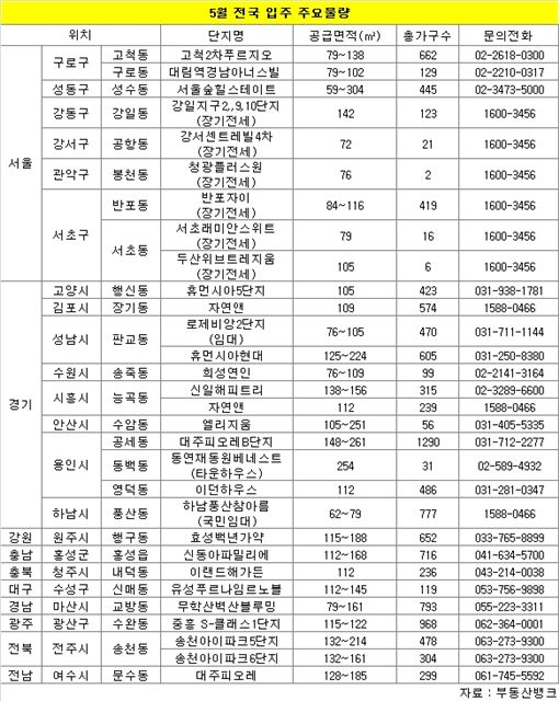 26일 부동산뱅크에 따르면 오는 5월 전국에서 임대를 포함해 총 40곳 1만4464가구가 입주한다. 지역별로는 ▲서울 총 10곳 1980가구 ▲경기 총 18곳 6768가구 ▲지방 총 12곳 5716가구며 인천에서는 입주 단지가 한 곳도 없는 것으로 나타났다.
