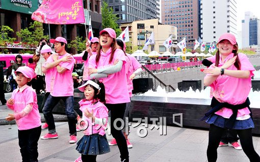 내달 2일 '하이서울페스티벌 2009'를 앞두고 26일 서울 청계광장에서 홍보 도우미들이 '꽃분홍길 봄바람 댄스' 사전 행사를 갖고 있다.