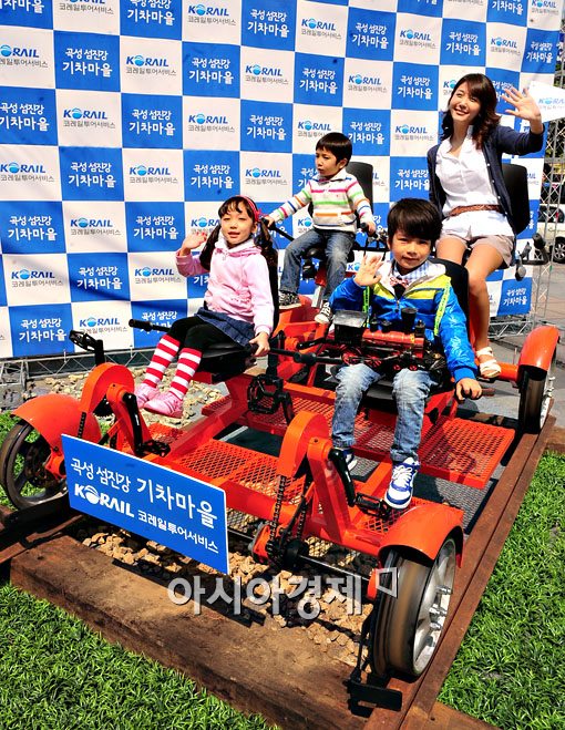 코레일투어서비스는 27일 서울 청계광장에서 전남 공성 '섬진강 기차마을'에서 탈수 있는 '레일 바이크'를 서울 시민들에게 선보이고 있다.