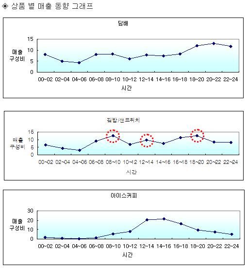 또 식사대용 김밥과 샌드위치는 식사시간인 오전 8시부터 10시, 오전 12시부터 오후 2시, 저녁 6시부터 8시사이가 하루 매출에 35.5%를 차지했다. 담배도 저녁 6시부터 자정까지가 총 하루 매출에서 36.8%나 팔렸다.