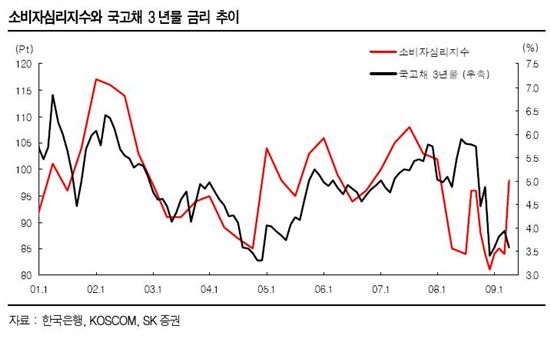전체적으로 향후 경기에 대한 전망이 크게 개선 가장 눈에 띄는 향후경기전망 CSI를 비롯해서 취업기회전망 CSI, 현재경기판단 CSI, 주식가치전망 CSI 등이 크게 상승. 그러나 물가수준전망 CSI는 소폭 하락, 금리수준전망 CSI는 오히려 상승하며 채권시장에 부담요인으로 작용할 것으로 예상.