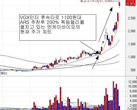 필자의 종목에서도 이번 강력한 파동랠리중에 이미 바닥에서 선취매하자고 추천한 에이텍이 추천 이후 450%가 넘는 엄청난 파동을 내고 있으며 VGX인터 역시 1100원대 선점해 120%가 넘는 강력한 파동랠리를 펼쳐주고 있으며 VGX인터 후속으로 추천 드린 엔케이바이오 역시 1100원대 선점해서 근 200% 가까운 파동을 단기에 내주고 있는 상황이다.
