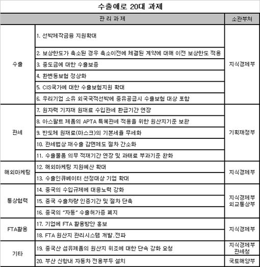 올 들어 정부는 수출업계와 8차례 간담회를 열어 발굴된 100여건의 과제중 수출애로 개선효과가 큰 20대 과제를 선정했다.