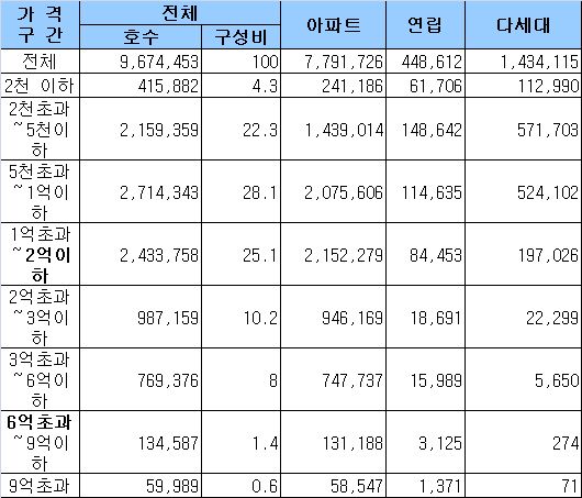 가장 많은 비중을 차지하는 공동주택은 5000만원 초과~1억원 이하로 아파트 207만5606가구 등 모두 271만4343가구였다.