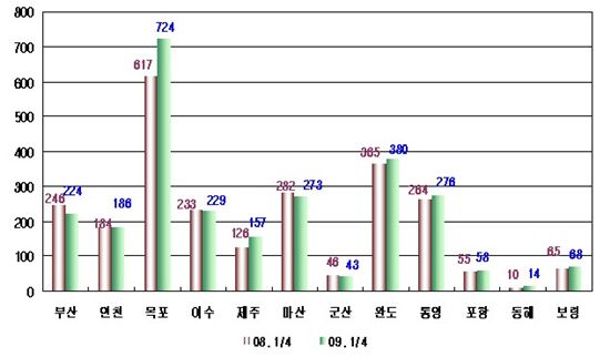 목포는 가장 많은 여객선 이용객이 몰린 것으로 조사됐다. 올 1분기 동안 72만4000명이 여객선을 이용했다. 이는 지난해 61만7000명 보다 17% 가량 상승한 수치다.