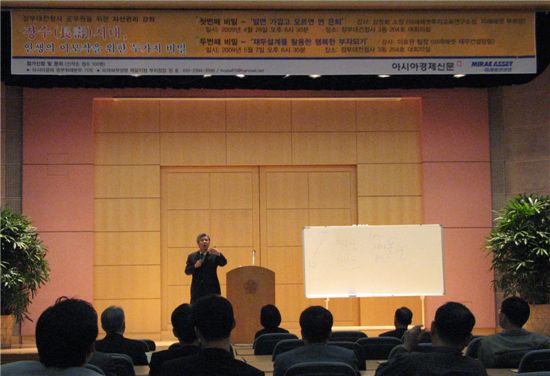 ‘장수시대 인생의 이모작을 위한 두 가지 비밀’이란 주제의 특강엔 강창희 미래에셋 부회장(미래에셋투자교육연구소장)이 강사로 나서 ‘고령화 시대 노후를 준비하는 법’에 대해 설명했다.