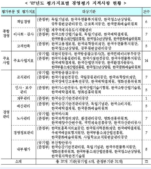 30일 기획재정부가 경영정보 공개시스템(알리오)에 통합 공시한 '2008년 공공기관 경영정보'에 따르면 297곳의 공공기관을 대상으로 지난해 경영평가를 실시한 결과 D+등급 이하를 받은 경우는 공기업 6곳을 포함해 총 37곳이나 됐다. 지적사항은 종합경영 18건, 주요사업 14건, 경영관리 40건 등 총 72건에 달했다.
