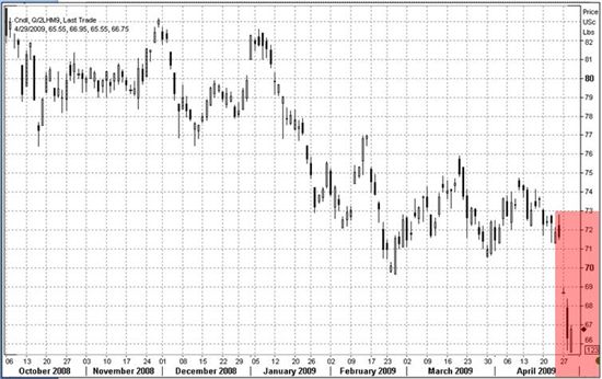CME 6월만기 생돈선물가격은 전일대비 1파운드당 0.45센트(0.68%) 오른 66.75센트에 거래를 마감, 급락 이틀만에 반등했다.