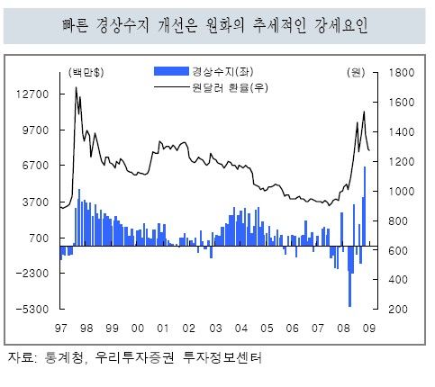현재 시장은 경기침체를 방어하기 위한 주요국들의 리플레이션 정책→미국, 중국 등 주요국 경제지표의 개선조짐→글로벌 경기회복 기대감 점증(위험자산 선호도 강화)→이머징 주식시장 및 통화 강세, 상품가격 상승 기대감 점증(달러 약세, 금값 안정) 등의 연결고리가 더 뚜렷해지고 있는 상황.