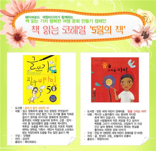 이달의 추천도서는 도서출판 페이퍼로드(대표 최용범)와 여원미디어(대표 김동휘)의 협조로 ‘글쓰기 필수 비타민 50’과 ‘꿈을 그리는 아이’다.