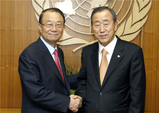 $pos="C";$title="";$txt="";$size="550,393,0";$no="2009050922004545595_1.jpg";@include $libDir . "/image_check.php";?>7일 오전 11시(현지시각) 최시중 방송통신위원회위원장과 반기문 유엔사무총장이 유엔사무총장실에서 만나 악수를 하고 있다. 방송통신 국제협력을 위해 미국을 방문중인 최 위원장은 이날 반 총장을 면담한 자리에서 “반 총장은 우리나라 5000년 역사 중 큰 인물로 꼽힌다”며 노고를 위로했다.