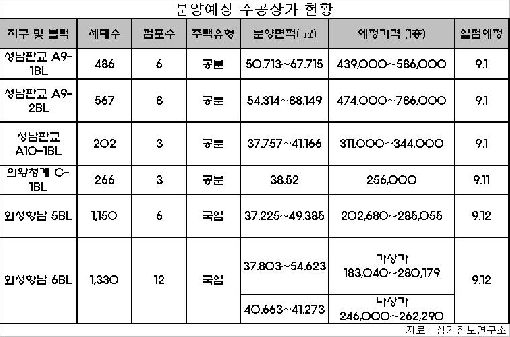 화성향남 5BL이 2억268만원∼2억8505만원선, 6BL 중 가상가는 1억8304만원∼2억8017만원선이며 나상가는 2억4600만원~2억6229만원, 의왕청계 C-1BL은 2억5600만원선에서 예정가가 책정돼 있다.