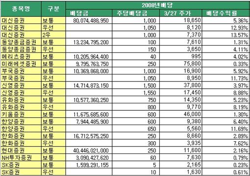 지난 2007년과 비교했을 때 대신증권을 비롯한 대다수 증권사 배당수익률이 높아진 반면 주당 배당금을 대폭 줄인 메리츠증권(400원→40원) 미래에셋(1000원→250원) 현대(450원→250원) NH투자(200원→60원) 등은 배당수익률이 더 낮아졌다.