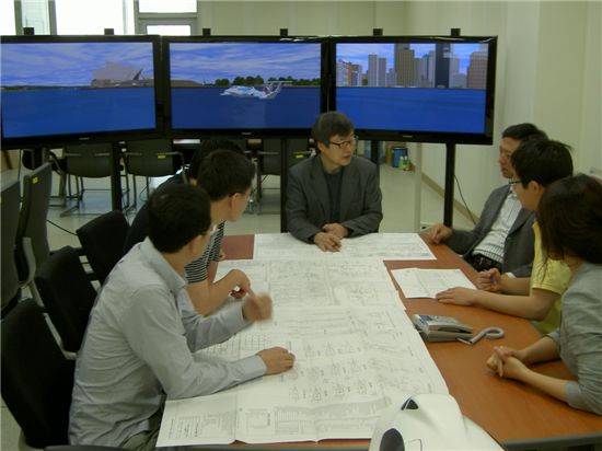 $pos="C";$title="";$txt="윙쉽테크놀로지 임직원들이 위그선 설계도면을 놓고 토론을 벌이고 있다. 사진 가운데가 강창구 대표.";$size="550,412,0";$no="2009051313282843197_1.jpg";@include $libDir . "/image_check.php";?>
