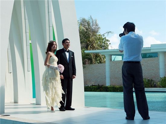 공개된 사진에서는 괌의 파란 하늘과 턱시도 차림의 동백과 웨딩드레스를 입은 지수의 모습이 어우러졌다.
