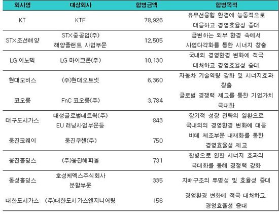 KT와 KTF 합병 금액은 7조8926억원, STX조선의 STX중공업 해양플랜트 사업 부문 합병 금액은 1조2505억원에 달한다. LG이노텍과 LG마이크론의 합병금액은 1조130억원, 현대모비스와 현대오토넷은 6360억원.