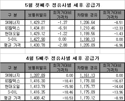15일 석유공사가 5월 첫째주(5월 3~9일) 정유사별 공급가격을 공개한 결과 보통휘발유 세후공급가 기준 에쓰오일이 리터당 1427.90원으로 가장 낮았다. 반면 GS칼텍스는 리터당 1434.81원으로 가장 비쌌고, SK에너지(1429.27원), 현대오일뱅크(1427.90원) 순이었다.