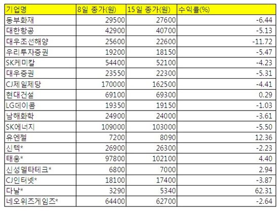 한 주간 추천종목 중에 가장 수익률이 저조했던 종목은 대우조선해양(-11.72%). 실적 악화에 비리의혹, 한화의 지분인수 관련 계약 해제 등 악재가 겹치면서 주가는 일주일 내내 급락했다.