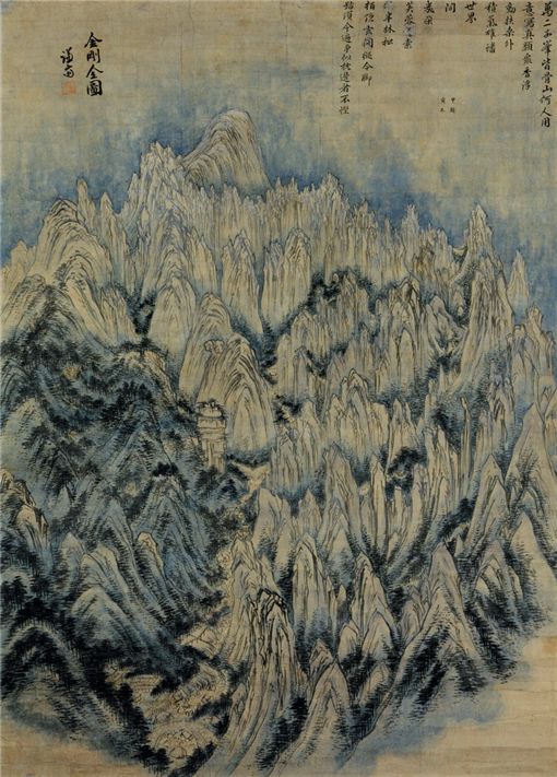 $pos="C";$title="";$txt="겸재 정선. 금강전도. 1734. 우리나라의 실제 경치를 보고 그리는 진경산수화를 시작한 겸재의 걸작이다. 당시에 중국 산수화를 따라 그린 그림이 많았지만 겸재는 직접 금강산을 보고 그렸다. 그림 속의 솟아오른 봉우리들이 호쾌하다. 그림의 독특한 구성은 음양오행의 원리를 따른 것이라는 해석이 있다.";$size="510,711,0";$no="2009051612324082802_1.jpg";@include $libDir . "/image_check.php";?>왕 역시 세상사에서 벗어나고 싶은 욕구는 일반인과 다르지 않았다.