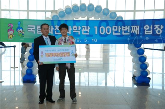 100만번째 입장의 행운은 경기도 광주시에 사는 탄벌중학교 2학년 김인태 군에게 돌아갔다. 김인태 군은 광주하남교육청(교육장 김석희) 부설 영재교육원에서 마련한 현장체험학습을 위해 과천과학관을 찾았다가 행운의 주인공이 됐다.
